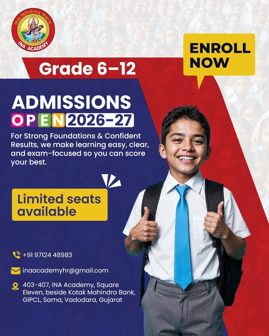 Established in 2018, INA Academy has grown into one of the best coaching classes in Baroda by focusing on complete academic and personal development. We don’t run crowded classrooms or follow one-size-fits-all teaching. Every student is guided with care, structure, and accountability.